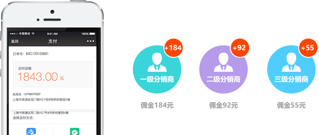 分销商收益=自己的产品佣金+下二级分销商销售;人人都能发展下级分销商,商品销售辐射圈呈几何倍数扩大; 分销商均享高佣金,无级别限制,超大吸引力,买家瞬间变分销卖家。